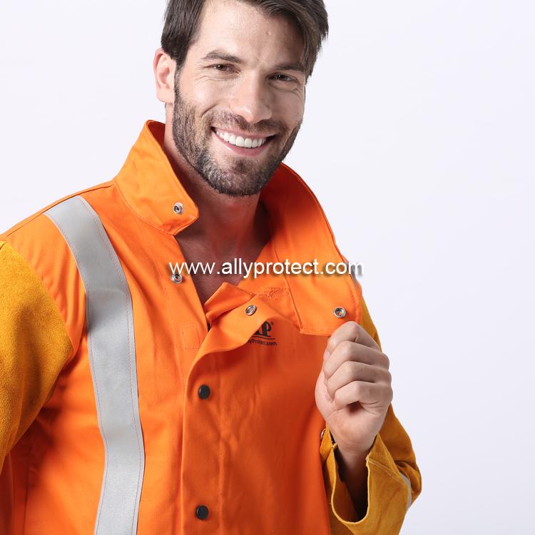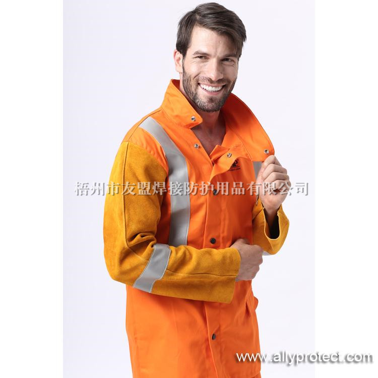- 產品描述: 衣袖采用金黃色牛二層皮,衣身采用橙紅色防護阻燃布,專為焊工在炎熱環境下工作而設計。帶反光條設計,提高作業安全性。